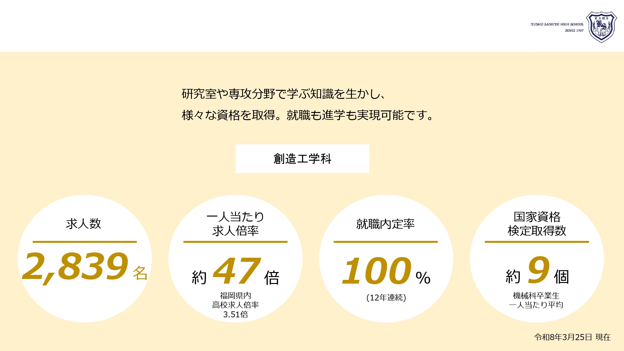 本校では学年をあげて企業を訪問し、求人への働きかけを行っています。本校は「資格の九産」と言われるように各種多数の資格を取得することが特徴であり、この資格を最大限に活かした就職支援を行います。また、面接を含めた作文・筆記試験の指導を個別に行うとともに多様化する就職システムに対応した指導を実施。3年次の就職指導に限らず、高校3年間を通して社会で通用する人間性と将来に対する展望を持つ教育を行っています。