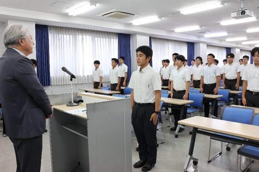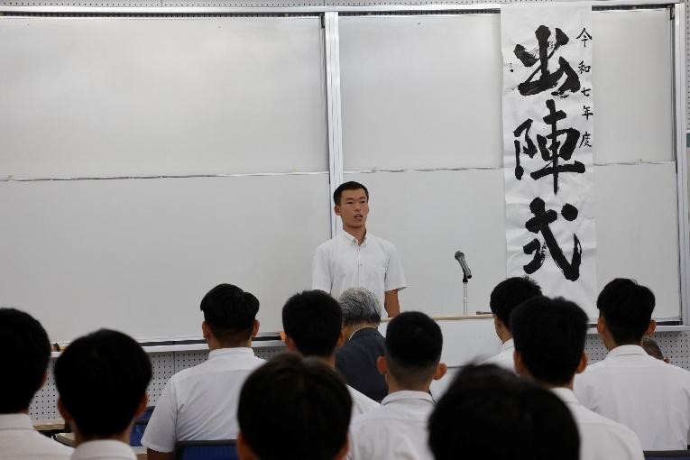 9月13日(金)、高校生の就職試験全国一斉解禁日(9月16日)に先立ち、出陣式が行われました。今年度は機械科61名が対象で、式では担任から一人ひとり名前を読み上げられ、受験企業名と意気込みを気持ちのこもった声で宣言しました。